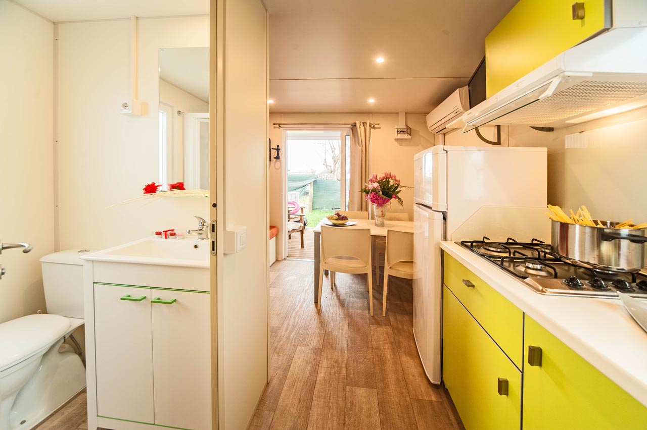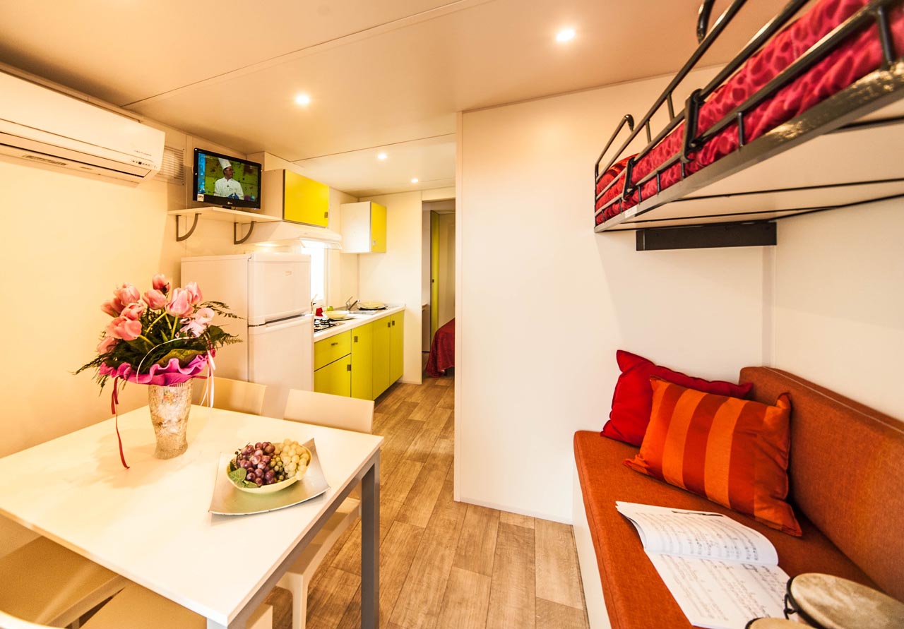 Bungalow con 4 posti letto composti da: camera matrimoniale, soggiorno con angolo cottura, letto a castello, bagno con doccia, veranda recintata con cancellino